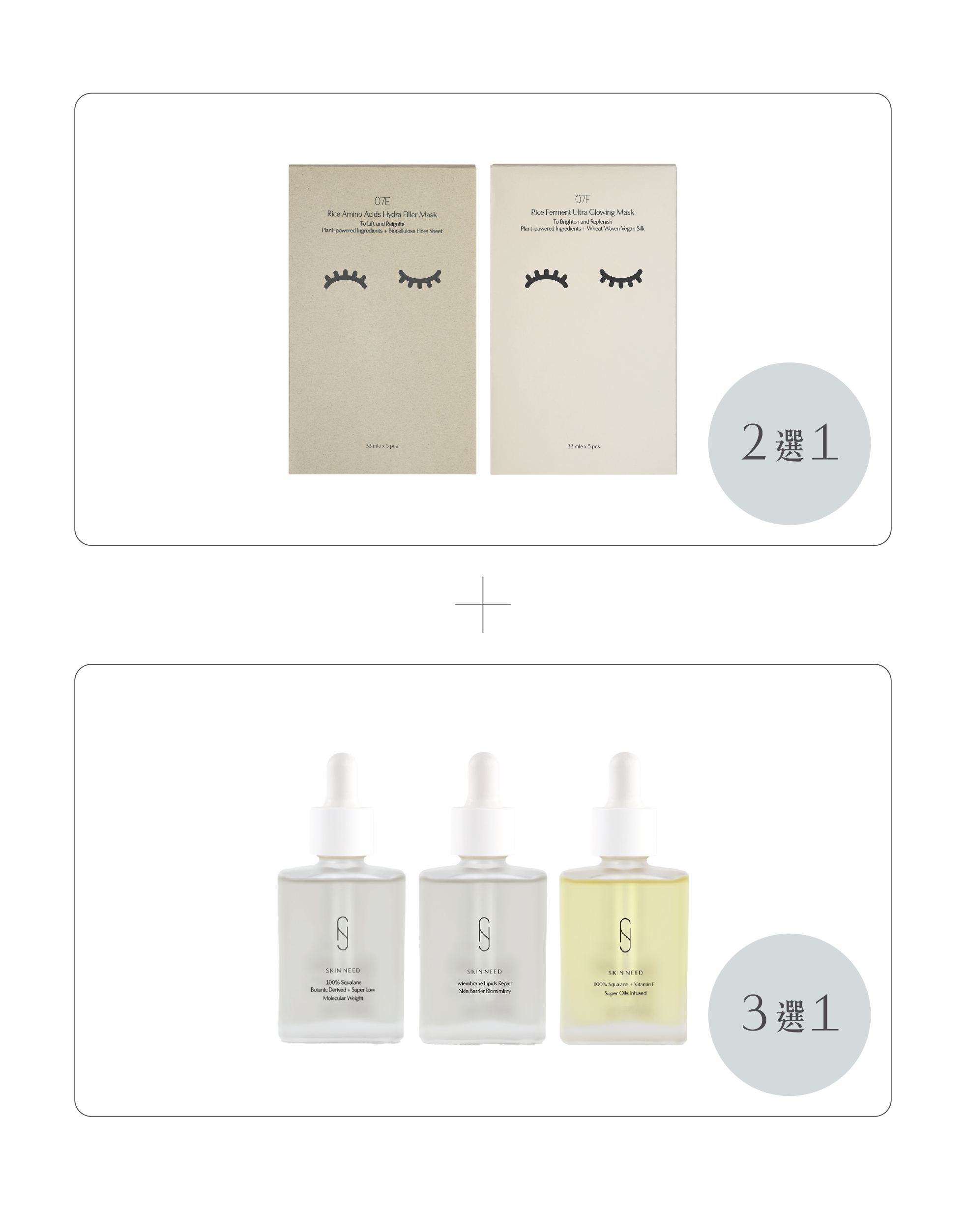 - 冬日深層滋養方案 $588 (原價 $866): 專為乾冷季節及敏弱肌而設,任選 1 款 CheckCheckCin x Skin Need 聯乘面膜(米糠氨基酸緊緻 / 大米美白水潤)搭配 1 款 油溶性精華(角磷脂分子釘 / 有機納米鯊烷 / 鯊烷維 F),透過面膜修復與精華油鎖水的黃金比例,即時修補屏障,令肌膚回復豐盈水潤。